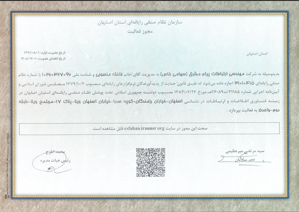شركت مهندسي ارتباطات پيام مشرق موفق شد بار ديگر گواهي معتبر نظام صنفي رايانهاي كشور را تمديد كند؛ گواهياي كه نشانگر ....